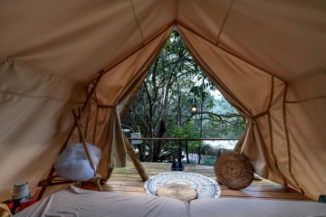 Luxusní glampingový stan pro dva, terasa s výhledem, maximální soukromí.